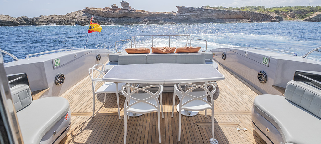 Included: Captain, stewardess, insurance, towels, complimentary drinks (water, ice, 24 soft drinks, 18 beers, 2 white wine, 2 rosé, 2 cava, 1 Champagne), snacks, fruit, snorkelling equipment, 2 paddle boards, 2 seabobs, jet ski, inflatable toys